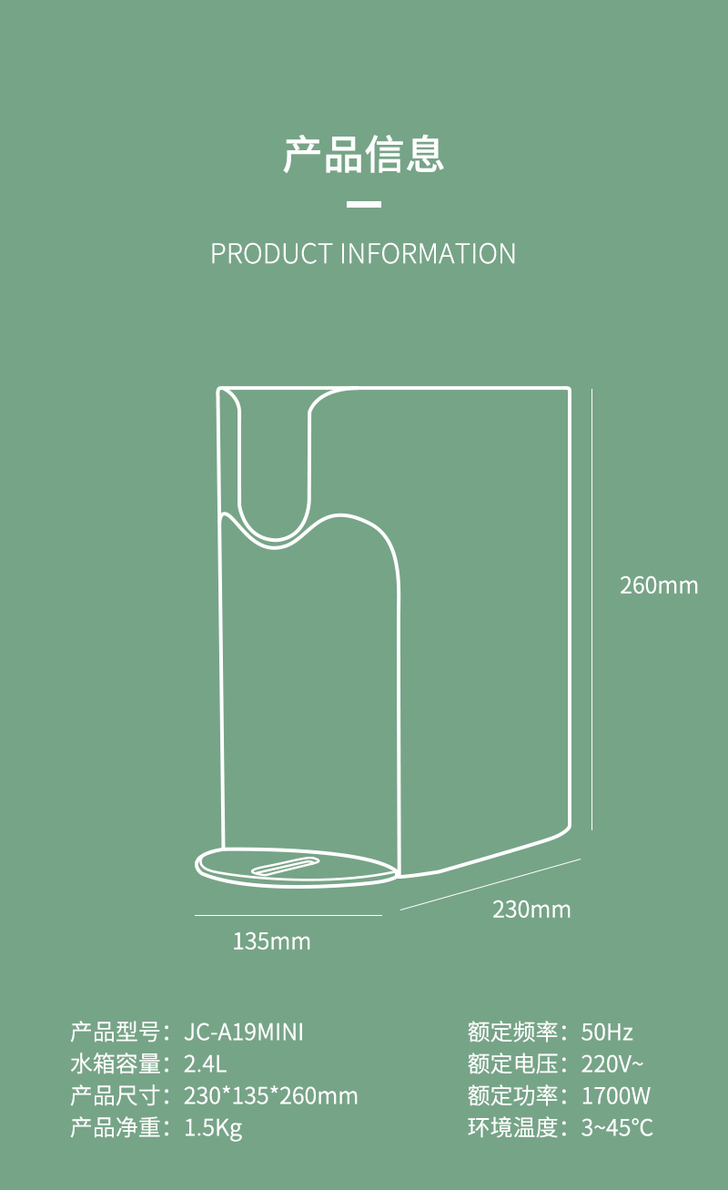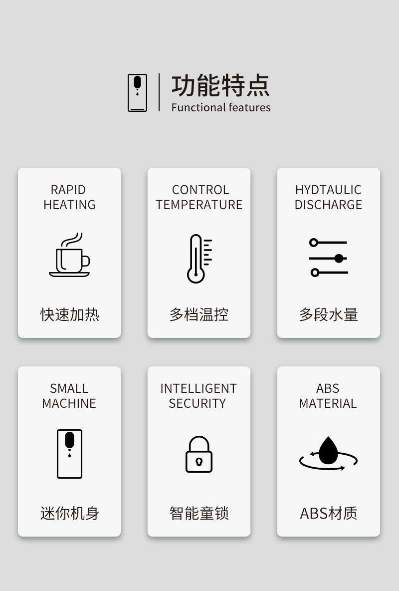 快速加熱、多檔溫控、多段水量、迷你機(jī)身、智能童鎖、ABS健康材質(zhì)
