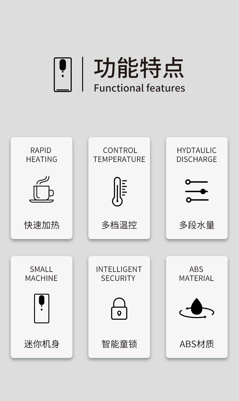 快速加熱、多檔溫控、多段水量、迷你機身、智能童鎖、ABS健康材質(zhì)